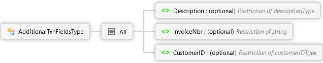 <xs:complexTypename="AdditionalTxnFieldsType"xmlns:xs="http://www.w3.org/2001/XMLSchema"><xs:all><xs:elementname="Description"type="descriptionType"minOccurs="0"><xs:annotation><xs:documentation><pxmlns="http://Hps.Exchange.PosGateway">Free-form description field. This must not contain sensitive information.</p></xs:documentation></xs:annotation></xs:element><xs:elementname="InvoiceNbr"minOccurs="0"><xs:annotation><xs:documentation><pxmlns="http://Hps.Exchange.PosGateway">Used to log the invoice number on transactions that are not eCommerce.</p></xs:documentation></xs:annotation><xs:simpleType><xs:restrictionbase="xs:string"><xs:maxLengthvalue="60"/></xs:restriction></xs:simpleType></xs:element><xs:elementname="CustomerID"type="customerIDType"minOccurs="0"><xs:annotation><xs:documentation><pxmlns="http://Hps.Exchange.PosGateway">Used to log Merchant specific customer identification.</p><pxmlns="http://Hps.Exchange.PosGateway"/><pxmlns="http://Hps.Exchange.PosGateway"><strong>Note:</strong> For GETI check transactions, this is sent in the CUSTOM3 field.