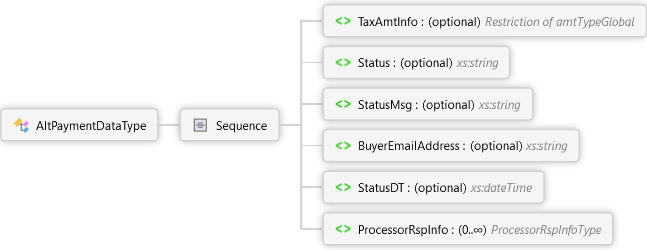 <xs:complexTypename="AltPaymentDataType"xmlns:xs="http://www.w3.org/2001/XMLSchema"><xs:sequence><xs:elementname="TaxAmtInfo"type="amtTypeGlobal"minOccurs="0"><xs:annotation><xs:documentation>Tax Amount</xs:documentation></xs:annotation></xs:element><xs:elementname="Status"type="xs:string"minOccurs="0"><xs:annotation><xs:documentation>Status</xs:documentation></xs:annotation></xs:element><xs:elementname="StatusMsg"type="xs:string"minOccurs="0"><xs:annotation><xs:documentation>Status Message</xs:documentation></xs:annotation></xs:element><xs:elementname="BuyerEmailAddress"type="xs:string"minOccurs="0"><xs:annotation><xs:documentation><pxmlns="http://Hps.Exchange.PosGateway">The Buyer Email Address associated with the AltPayment at the time the transaction was processed.</p></xs:documentation></xs:annotation></xs:element><xs:elementname="StatusDT"type="xs:dateTime"minOccurs="0"><xs:annotation><xs:documentation><pxmlns="http://Hps.Exchange.PosGateway">Date and time the status was recorded.</p></xs:documentation></xs:annotation></xs:element><xs:elementname="ProcessorRspInfo"type="ProcessorRspInfoType"minOccurs="0"maxOccurs="unbounded"><xs:annotation><xs:documentation><pxmlns="http://Hps.Exchange.PosGateway">Additional data that may be provided by specific processors</p></xs:documentation></xs:annotation></xs:element></xs:sequence></xs:complexType>