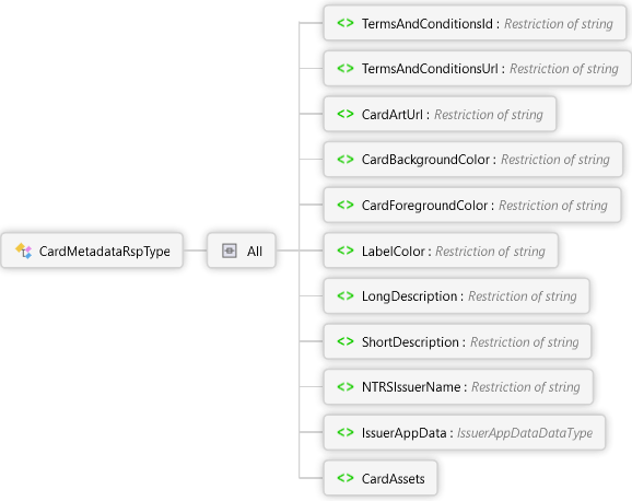CardAssets Element IssuerAppData Element NTRSIssuerName Element ShortDescription Element LongDescription Element LabelColor Element CardForegroundColor Element CardBackgroundColor Element CardArtUrl Element TermsAndConditionsUrl Element TermsAndConditionsId Element All CardMetadataRspType Complex Type