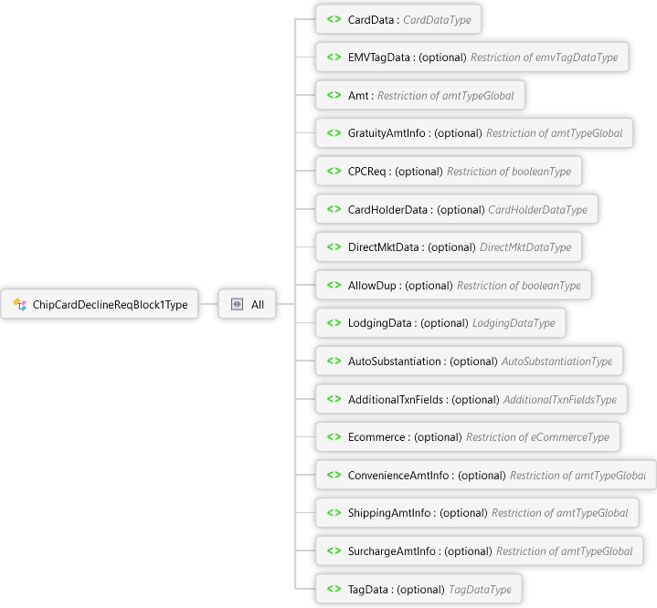 TagData Element SurchargeAmtInfo Element ShippingAmtInfo Element ConvenienceAmtInfo Element Ecommerce Element AdditionalTxnFields Element AutoSubstantiation Element LodgingData Element AllowDup Element DirectMktData Element CardHolderData Element CPCReq Element GratuityAmtInfo Element Amt Element EMVTagData Element CardData Element All ChipCardDeclineReqBlock1Type Complex Type