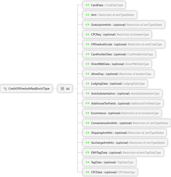 CPCData Element TagData Element EMVTagData Element SurchargeAmtInfo Element ShippingAmtInfo Element ConvenienceAmtInfo Element Ecommerce Element AdditionalTxnFields Element AutoSubstantiation Element LodgingData Element AllowDup Element DirectMktData Element CardHolderData Element OfflineAuthCode Element CPCReq Element GratuityAmtInfo Element Amt Element CardData Element All CreditOfflineAuthReqBlock1Type Complex Type