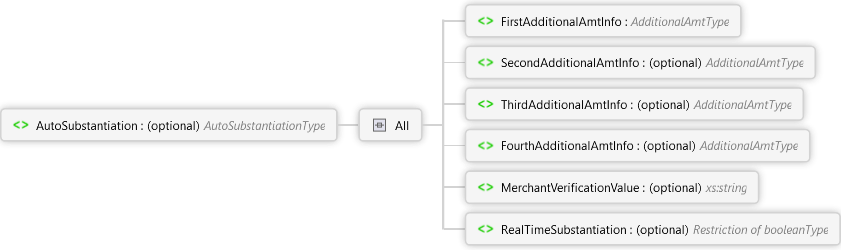 RealTimeSubstantiation Element MerchantVerificationValue Element FourthAdditionalAmtInfo Element ThirdAdditionalAmtInfo Element SecondAdditionalAmtInfo Element FirstAdditionalAmtInfo Element All AutoSubstantiation Element