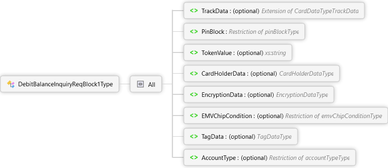 AccountType Element TagData Element EMVChipCondition Element EncryptionData Element CardHolderData Element TokenValue Element PinBlock Element TrackData Element All DebitBalanceInquiryReqBlock1Type Complex Type