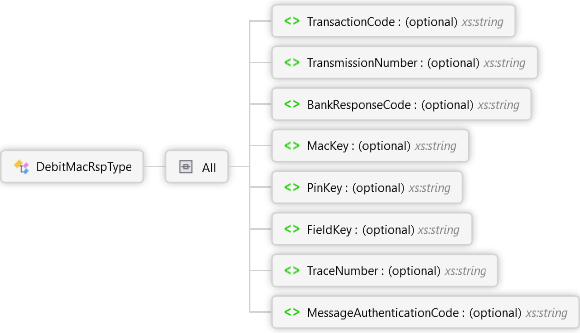 MessageAuthenticationCode Element TraceNumber Element FieldKey Element PinKey Element MacKey Element BankResponseCode Element TransmissionNumber Element TransactionCode Element All DebitMacRspType Complex Type