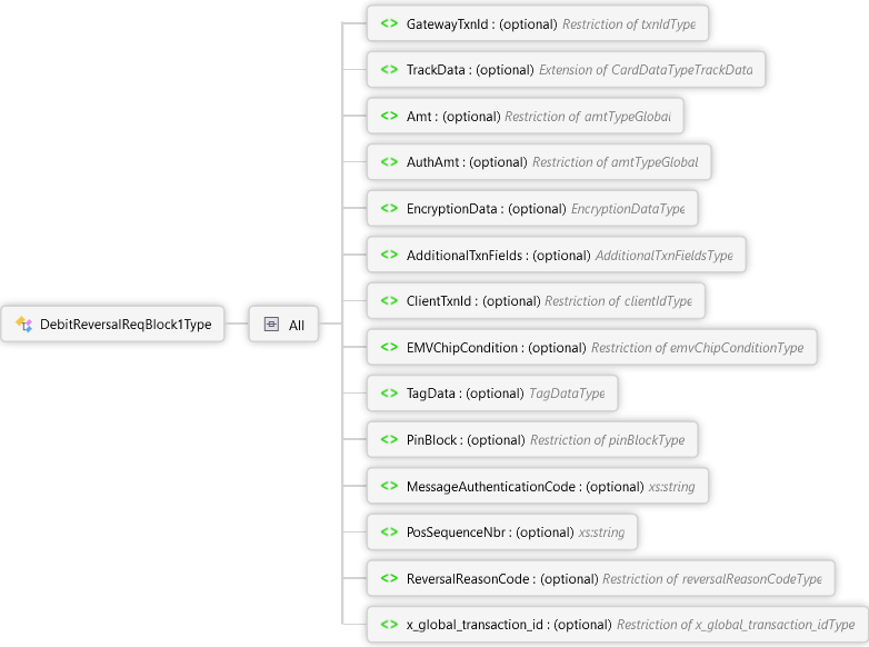 x_global_transaction_id Element ReversalReasonCode Element PosSequenceNbr Element MessageAuthenticationCode Element PinBlock Element TagData Element EMVChipCondition Element ClientTxnId Element AdditionalTxnFields Element EncryptionData Element AuthAmt Element Amt Element TrackData Element GatewayTxnId Element All DebitReversalReqBlock1Type Complex Type