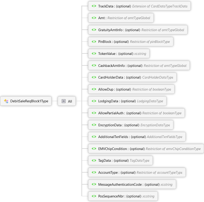 PosSequenceNbr Element MessageAuthenticationCode Element AccountType Element TagData Element EMVChipCondition Element AdditionalTxnFields Element EncryptionData Element AllowPartialAuth Element LodgingData Element AllowDup Element CardHolderData Element CashbackAmtInfo Element TokenValue Element PinBlock Element GratuityAmtInfo Element Amt Element TrackData Element All DebitSaleReqBlock1Type Complex Type