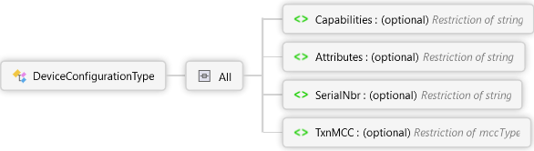 <xs:complexTypename="DeviceConfigurationType"xmlns:xs="http://www.w3.org/2001/XMLSchema"><xs:all><xs:elementname="Capabilities"minOccurs="0"><xs:annotation><xs:documentation><pxmlns="http://Hps.Exchange.PosGateway">Capabilities for a Device</p></xs:documentation></xs:annotation><xs:simpleType><xs:restrictionbase="xs:string"><xs:maxLengthvalue="30"/></xs:restriction></xs:simpleType></xs:element><xs:elementname="Attributes"minOccurs="0"><xs:annotation><xs:documentation><pxmlns="http://Hps.Exchange.PosGateway">Attributes for a Device</p></xs:documentation></xs:annotation><xs:simpleType><xs:restrictionbase="xs:string"><xs:maxLengthvalue="30"/></xs:restriction></xs:simpleType></xs:element><xs:elementname="SerialNbr"minOccurs="0"><xs:annotation><xs:documentation><pxmlns="http://Hps.Exchange.PosGateway">Serial number of PIN pad or PIN entry device (PED).</p><pxmlns="http://Hps.Exchange.PosGateway"><b>Note:</b> Required for Interac debit services in Canada and P2PE TDES transactions.