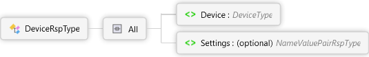 <xs:complexType name="DeviceRspType" xmlns:xs="http://www.w3.org/2001/XMLSchema"> <xs:all> <xs:element name="Device" type="DeviceType" /> <xs:element name="Settings" type="NameValuePairRspType" minOccurs="0" /> </xs:all> </xs:complexType>