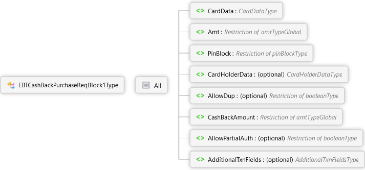 AdditionalTxnFields Element AllowPartialAuth Element CashBackAmount Element AllowDup Element CardHolderData Element PinBlock Element Amt Element CardData Element All EBTCashBackPurchaseReqBlock1Type Complex Type