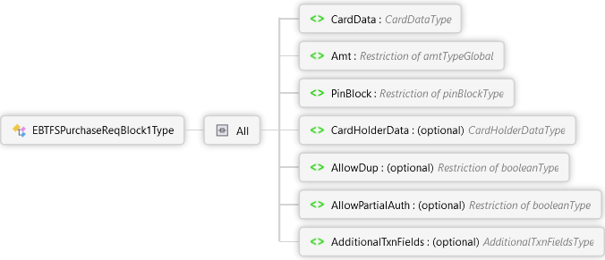 AdditionalTxnFields Element AllowPartialAuth Element AllowDup Element CardHolderData Element PinBlock Element Amt Element CardData Element All EBTFSPurchaseReqBlock1Type Complex Type