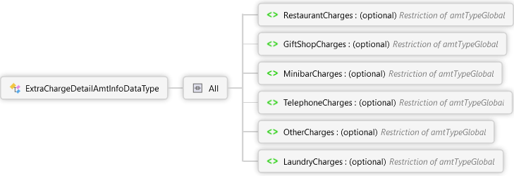 <xs:complexType name="ExtraChargeDetailAmtInfoDataType" xmlns:xs="http://www.w3.org/2001/XMLSchema"> <xs:all> <xs:element name="RestaurantCharges" type="amtTypeGlobal" minOccurs="0"> <xs:annotation> <xs:documentation> <p xmlns="http://Hps.Exchange.PosGateway"> Restaurant amount. <b>For Feature Use</b></p> </xs:documentation> </xs:annotation> </xs:element> <xs:element name="GiftShopCharges" type="amtTypeGlobal" minOccurs="0"> <xs:annotation> <xs:documentation> <p xmlns="http://Hps.Exchange.PosGateway"> Gift shop amount. <b>For Feature Use</b></p> </xs:documentation> </xs:annotation> </xs:element> <xs:element name="MinibarCharges" type="amtTypeGlobal" minOccurs="0"> <xs:annotation> <xs:documentation> <p xmlns="http://Hps.Exchange.PosGateway"> Mini-bar amount. <b>For Feature Use</b></p> </xs:documentation> </xs:annotation> </xs:element> <xs:element name="TelephoneCharges" type="amtTypeGlobal" minOccurs="0"> <xs:annotation> <xs:documentation> <p xmlns="http://Hps.Exchange.PosGateway"> Telephone amount. <b>For Feature Use</b></p> </xs:documentation> </xs:annotation> </xs:element> <xs:element name="OtherCharges" type="amtTypeGlobal" minOccurs="0"> <xs:annotation> <xs:documentation> <p xmlns="http://Hps.Exchange.PosGateway"> Other amounts. <b>For Feature Use</b></p> </xs:documentation> </xs:annotation> </xs:element> <xs:element name="LaundryCharges" type="amtTypeGlobal" minOccurs="0"> <xs:annotation> <xs:documentation> <p xmlns="http://Hps.Exchange.PosGateway"> Laundry amount. <b>For Feature Use</b></p> </xs:documentation> </xs:annotation> </xs:element> </xs:all> </xs:complexType>
