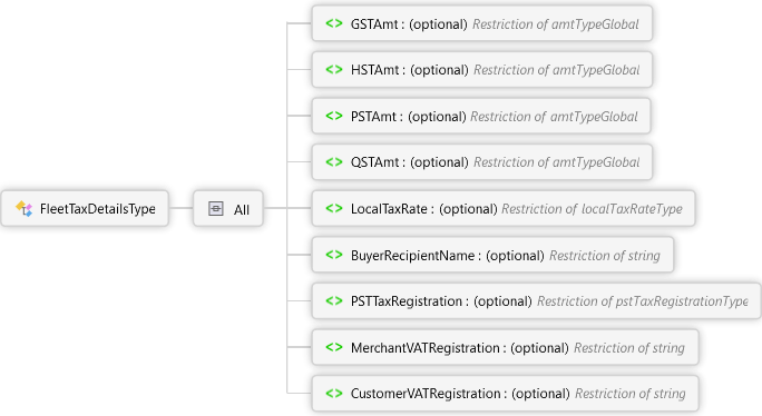 <xs:complexTypename="FleetTaxDetailsType"xmlns:xs="http://www.w3.org/2001/XMLSchema"><xs:all><xs:elementname="GSTAmt"type="amtTypeGlobal"minOccurs="0"><xs:annotation><xs:documentation><pxmlns="http://Hps.Exchange.PosGateway">Goods and Services Tax.</p></xs:documentation></xs:annotation></xs:element><xs:elementname="HSTAmt"type="amtTypeGlobal"minOccurs="0"><xs:annotation><xs:documentation><pxmlns="http://Hps.Exchange.PosGateway">Harmonized Sales Tax.</p></xs:documentation></xs:annotation></xs:element><xs:elementname="PSTAmt"type="amtTypeGlobal"minOccurs="0"><xs:annotation><xs:documentation><pxmlns="http://Hps.Exchange.PosGateway">Provincial Sales Tax.</p></xs:documentation></xs:annotation></xs:element><xs:elementname="QSTAmt"type="amtTypeGlobal"minOccurs="0"><xs:annotation><xs:documentation><pxmlns="http://Hps.Exchange.PosGateway">Quebec Sales Tax.</p></xs:documentation></xs:annotation></xs:element><xs:elementname="LocalTaxRate"type="localTaxRateType"minOccurs="0"><xs:annotation><xs:documentation><pxmlns="http://Hps.Exchange.PosGateway">Local Tax Rate.</p><pxmlns="http://Hps.Exchange.PosGateway"><strong>Note:</strong> For Visa Fleet Cards only.