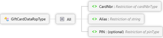 <xs:complexTypename="GiftCardDataRspType"xmlns:xs="http://www.w3.org/2001/XMLSchema"><xs:all><xs:elementname="CardNbr"type="cardNbrType"><xs:annotation><xs:documentation><pxmlns="http://Hps.Exchange.PosGateway">Stored value account number</p></xs:documentation></xs:annotation></xs:element><xs:elementname="Alias"><xs:annotation><xs:documentation><pxmlns="http://Hps.Exchange.PosGateway">Echoed from the request</p></xs:documentation></xs:annotation><xs:simpleType><xs:restrictionbase="xs:string"><xs:maxLengthvalue="100"/></xs:restriction></xs:simpleType></xs:element><xs:elementname="PIN"minOccurs="0"><xs:annotation><xs:documentation><pxmlns="http://Hps.Exchange.PosGateway">A numeric PIN associated with the stored value account.</p><pxmlns="http://Hps.Exchange.PosGateway"/><pxmlns="http://Hps.Exchange.PosGateway"><strong>Note:</strong> This is not a PIN block as defined in debit transactions.