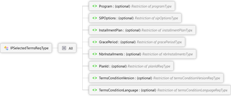 <ul><li>00 - No promotion</li><li>03 - Without interest to the cardholder</li><li>05 - With interest to the cardholder</li><li>07 - Buy today, pay later</li></ul></p><pxmlns="http://Hps.Exchange.PosGateway"/></xs:documentation></xs:annotation></xs:element><xs:elementname="GracePeriod"type="gracePeriodType"minOccurs="0"><xs:annotation><xs:documentation><pxmlns="http://Hps.Exchange.PosGateway">The grace period before the first payment. 00 indicates no grace period</p><pxmlns="http://Hps.Exchange.PosGateway">Required for merchants in Mexico</p></xs:documentation></xs:annotation></xs:element><xs:elementname="NbrInstallments"type="nbrInstallmentsType"minOccurs="0"><xs:annotation><xs:documentation><pxmlns="http://Hps.Exchange.PosGateway">The total number of installments</p><pxmlns="http://Hps.Exchange.PosGateway">This field is available to merchants in Asia Pacific and merchants in Mexico</p></xs:documentation></xs:annotation></xs:element><xs:elementname="PlanId"type="planIdReqType"minOccurs="0"><xs:annotation><xs:documentation><pxmlns="http://Hps.Exchange.PosGateway">The PlanId of the customer's selected VIS installment plan</p><pxmlns="http://Hps.Exchange.PosGateway">Required when the Program is VIS</p></xs:documentation></xs:annotation></xs:element><xs:elementname="TermsConditionVersion"type="termsConditionVersionReqType"minOccurs="0"><xs:annotation><xs:documentation><pxmlns="http://Hps.Exchange.PosGateway">The Terms and Conditions version the customer's selected VIS installment plan</p><pxmlns="http://Hps.Exchange.PosGateway">Required when the Program is VIS</p></xs:documentation></xs:annotation></xs:element><xs:elementname="TermsConditionLanguage"type="termsConditionLanguageReqType"minOccurs="0"><xs:annotation><xs:documentation><pxmlns="http://Hps.Exchange.PosGateway">The Language Code the customer's selected VIS installment plan</p><pxmlns="http://Hps.Exchange.PosGateway">Required when the Program is VIS</p></xs:documentation></xs:annotation></xs:element></xs:all></xs:complexType>
