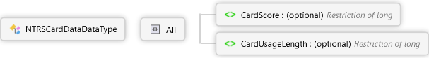 <xs:complexTypename="NTRSCardDataDataType"xmlns:xs="http://www.w3.org/2001/XMLSchema"><xs:all><xs:elementname="CardScore"minOccurs="0"><xs:annotation><xs:documentation><pxmlns="http://Hps.Exchange.PosGateway">The score of the card.</p></xs:documentation></xs:annotation><xs:simpleType><xs:restrictionbase="xs:long"><xs:patternvalue="\d{1,11}"/></xs:restriction></xs:simpleType></xs:element><xs:elementname="CardUsageLength"minOccurs="0"><xs:annotation><xs:documentation><pxmlns="http://Hps.Exchange.PosGateway">The time in days that the card has been in use.</p></xs:documentation></xs:annotation><xs:simpleType><xs:restrictionbase="xs:long"><xs:patternvalue="\d{1,11}"/></xs:restriction></xs:simpleType></xs:element></xs:all></xs:complexType>