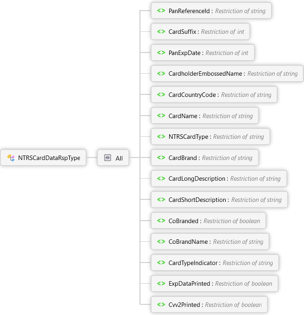 <xs:complexTypename="NTRSCardDataRspType"xmlns:xs="http://www.w3.org/2001/XMLSchema"><xs:all><xs:elementname="PanReferenceId"><xs:annotation><xs:documentation><pxmlns="http://Hps.Exchange.PosGateway">The unique reference ID (GUID format) of the real PAN.</p></xs:documentation></xs:annotation><xs:simpleType><xs:restrictionbase="xs:string"/></xs:simpleType></xs:element><xs:elementname="CardSuffix"><xs:annotation><xs:documentation><pxmlns="http://Hps.Exchange.PosGateway">The last four digits of the real PAN.</p></xs:documentation></xs:annotation><xs:simpleType><xs:restrictionbase="xs:int"/></xs:simpleType></xs:element><xs:elementname="PanExpDate"><xs:annotation><xs:documentation><pxmlns="http://Hps.Exchange.PosGateway">The expiry date of the real PAN. The format is 'YYMM'.</p></xs:documentation></xs:annotation><xs:simpleType><xs:restrictionbase="xs:int"/></xs:simpleType></xs:element><xs:elementname="CardholderEmbossedName"><xs:annotation><xs:documentation><pxmlns="http://Hps.Exchange.PosGateway">The embossed name on the physical card.</p></xs:documentation></xs:annotation><xs:simpleType><xs:restrictionbase="xs:string"/></xs:simpleType></xs:element><xs:elementname="CardCountryCode"><xs:annotation><xs:documentation><pxmlns="http://Hps.Exchange.PosGateway">A 2 character country code.</p></xs:documentation></xs:annotation><xs:simpleType><xs:restrictionbase="xs:string"/></xs:simpleType></xs:element><xs:elementname="CardName"><xs:annotation><xs:documentation><pxmlns="http://Hps.Exchange.PosGateway">The name of the card.</p></xs:documentation></xs:annotation><xs:simpleType><xs:restrictionbase="xs:string"/></xs:simpleType></xs:element><xs:elementname="NTRSCardType"><xs:annotation><xs:documentation><pxmlns="http://Hps.Exchange.PosGateway">The type of the card product. Allowed values: CREDIT, DEBIT, PREPAID, UNKNOWN</p></xs:documentation></xs:annotation><xs:simpleType><xs:restrictionbase="xs:string"/></xs:simpleType></xs:element><xs:elementname="CardBrand"><xs:annotation><xs:documentation><pxmlns="http://Hps.Exchange.PosGateway">The brand of the card.</p></xs:documentation></xs:annotation><xs:simpleType><xs:restrictionbase="xs:string"/></xs:simpleType></xs:element><xs:elementname="CardLongDescription"><xs:annotation><xs:documentation><pxmlns="http://Hps.Exchange.PosGateway">The long description of the card.</p></xs:documentation></xs:annotation><xs:simpleType><xs:restrictionbase="xs:string"/></xs:simpleType></xs:element><xs:elementname="CardShortDescription"><xs:annotation><xs:documentation><pxmlns="http://Hps.Exchange.PosGateway">The short description of the card.</p></xs:documentation></xs:annotation><xs:simpleType><xs:restrictionbase="xs:string"/></xs:simpleType></xs:element><xs:elementname="CoBranded"><xs:annotation><xs:documentation><pxmlns="http://Hps.Exchange.PosGateway">It indicates if the card is a co-branded card.</p></xs:documentation></xs:annotation><xs:simpleType><xs:restrictionbase="xs:boolean"/></xs:simpleType></xs:element><xs:elementname="CoBrandName"><xs:annotation><xs:documentation><pxmlns="http://Hps.Exchange.PosGateway">The card co-brand name.</p></xs:documentation></xs:annotation><xs:simpleType><xs:restrictionbase="xs:string"/></xs:simpleType></xs:element><xs:elementname="CardTypeIndicator"><xs:annotation><xs:documentation><pxmlns="http://Hps.Exchange.PosGateway">Indication if the token requestor supports debit cards, credit cards or both.</p></xs:documentation></xs:annotation><xs:simpleType><xs:restrictionbase="xs:string"/></xs:simpleType></xs:element><xs:elementname="ExpDataPrinted"><xs:annotation><xs:documentation><pxmlns="http://Hps.Exchange.PosGateway">It indicates if the expiration date is printed on the card or not.</p></xs:documentation></xs:annotation><xs:simpleType><xs:restrictionbase="xs:boolean"/></xs:simpleType></xs:element><xs:elementname="Cvv2Printed"><xs:annotation><xs:documentation><pxmlns="http://Hps.Exchange.PosGateway">It indicates if the cvv2 is printed on the card or not.</p></xs:documentation></xs:annotation><xs:simpleType><xs:restrictionbase="xs:boolean"/></xs:simpleType></xs:element></xs:all></xs:complexType>