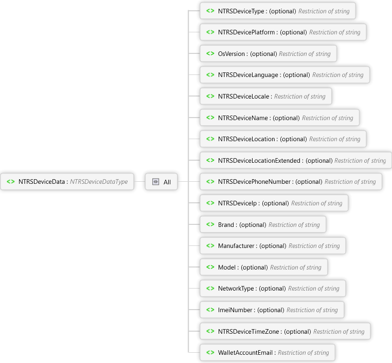 <xs:elementname="NTRSDeviceData"type="NTRSDeviceDataType"minOccurs="1"xmlns:xs="http://www.w3.org/2001/XMLSchema"><xs:annotation><xs:documentation><pxmlns="http://Hps.Exchange.PosGateway">Data related to the user's browser or mobile device.</p></xs:documentation></xs:annotation></xs:element>