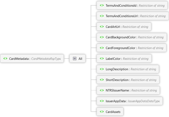 CardAssets Element IssuerAppData Element NTRSIssuerName Element ShortDescription Element LongDescription Element LabelColor Element CardForegroundColor Element CardBackgroundColor Element CardArtUrl Element TermsAndConditionsUrl Element TermsAndConditionsId Element All CardMetadata Element