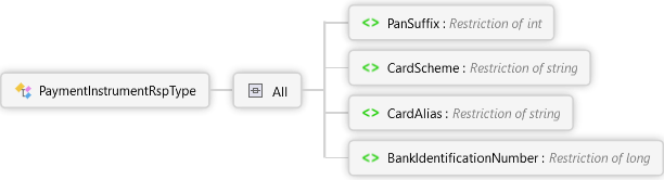 <xs:complexTypename="PaymentInstrumentRspType"xmlns:xs="http://www.w3.org/2001/XMLSchema"><xs:all><xs:elementname="PanSuffix"><xs:annotation><xs:documentation><pxmlns="http://Hps.Exchange.PosGateway">The last four digits of the real PAN.</p></xs:documentation></xs:annotation><xs:simpleType><xs:restrictionbase="xs:int"/></xs:simpleType></xs:element><xs:elementname="CardScheme"><xs:annotation><xs:documentation><pxmlns="http://Hps.Exchange.PosGateway">The brand of the card.</p></xs:documentation></xs:annotation><xs:simpleType><xs:restrictionbase="xs:string"/></xs:simpleType></xs:element><xs:elementname="CardAlias"><xs:annotation><xs:documentation><pxmlns="http://Hps.Exchange.PosGateway">The name of the card.</p></xs:documentation></xs:annotation><xs:simpleType><xs:restrictionbase="xs:string"/></xs:simpleType></xs:element><xs:elementname="BankIdentificationNumber"><xs:annotation><xs:documentation><pxmlns="http://Hps.Exchange.PosGateway">The first six digits of the real PAN.</p></xs:documentation></xs:annotation><xs:simpleType><xs:restrictionbase="xs:long"/></xs:simpleType></xs:element></xs:all></xs:complexType>
