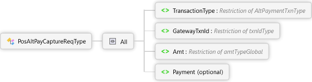 <xs:complexTypename="PosAltPayCaptureReqType"xmlns:xs="http://www.w3.org/2001/XMLSchema"><xs:all><xs:elementname="TransactionType"type="AltPaymentTxnType"><xs:annotation><xs:documentation><pxmlns="http://Hps.Exchange.PosGateway">Alternate Payment Transaction Type</p></xs:documentation></xs:annotation></xs:element><xs:elementname="GatewayTxnId"type="txnIdType"><xs:annotation><xs:documentation><pxmlns="http://Hps.Exchange.PosGateway">Gateway generated transaction identifier returned in the response of the original transaction. This indicates the AltPayment transaction to be captured against.</p></xs:documentation></xs:annotation></xs:element><xs:elementname="Amt"type="amtTypeGlobal"><xs:annotation><xs:documentation><pxmlns="http://Hps.Exchange.PosGateway">Amount for the capture</p></xs:documentation></xs:annotation></xs:element><xs:elementname="Payment"minOccurs="0"><xs:annotation><xs:documentation><pxmlns="http://Hps.Exchange.PosGateway">Payment Information for the capture</p></xs:documentation></xs:annotation><xs:complexType><xs:sequencemaxOccurs="200"><xs:elementname="NameValuePair"type="NameValuePairType"/></xs:sequence></xs:complexType></xs:element></xs:all></xs:complexType>