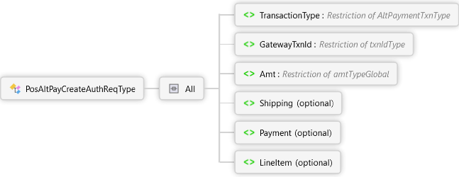 <xs:complexTypename="PosAltPayCreateAuthReqType"xmlns:xs="http://www.w3.org/2001/XMLSchema"><xs:all><xs:elementname="TransactionType"type="AltPaymentTxnType"><xs:annotation><xs:documentation><pxmlns="http://Hps.Exchange.PosGateway">Alternate Payment Transaction Type</p></xs:documentation></xs:annotation></xs:element><xs:elementname="GatewayTxnId"type="txnIdType"><xs:annotation><xs:documentation><pxmlns="http://Hps.Exchange.PosGateway">Gateway generated transaction identifier returned in the response of the original transaction. This indicates the original Alt Payment transaction to create an authorization against.</p></xs:documentation></xs:annotation></xs:element><xs:elementname="Amt"type="amtTypeGlobal"><xs:annotation><xs:documentation><pxmlns="http://Hps.Exchange.PosGateway">Amount for the new authorization</p></xs:documentation></xs:annotation></xs:element><xs:elementname="Shipping"minOccurs="0"><xs:annotation><xs:documentation><pxmlns="http://Hps.Exchange.PosGateway">Shipping Information for the new authorization</p></xs:documentation></xs:annotation><xs:complexType><xs:sequencemaxOccurs="10"><xs:elementname="Address"type="NameValuePairCollectionType"><xs:annotation><xs:documentation>Address Information</xs:documentation></xs:annotation></xs:element></xs:sequence></xs:complexType></xs:element><xs:elementname="Payment"minOccurs="0"><xs:annotation><xs:documentation><pxmlns="http://Hps.Exchange.PosGateway">Payment Information for the new authorization</p></xs:documentation></xs:annotation><xs:complexType><xs:sequencemaxOccurs="200"><xs:elementname="NameValuePair"type="NameValuePairType"/></xs:sequence></xs:complexType></xs:element><xs:elementname="LineItem"minOccurs="0"><xs:annotation><xs:documentation><pxmlns="http://Hps.Exchange.PosGateway">Line Item purchase information for the new authorization</p></xs:documentation></xs:annotation><xs:complexType><xs:sequencemaxOccurs="100"><xs:elementname="Detail"type="NameValuePairCollectionType"><xs:annotation><xs:documentation>Detail Information</xs:documentation></xs:annotation></xs:element></xs:sequence></xs:complexType></xs:element></xs:all></xs:complexType>