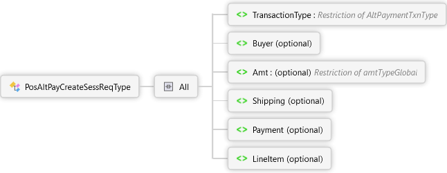 <xs:complexTypename="PosAltPayCreateSessReqType"xmlns:xs="http://www.w3.org/2001/XMLSchema"><xs:all><xs:elementname="TransactionType"type="AltPaymentTxnType"><xs:annotation><xs:documentation><pxmlns="http://Hps.Exchange.PosGateway">Alternate Payment Transaction Type</p></xs:documentation></xs:annotation></xs:element><xs:elementname="Buyer"minOccurs="0"><xs:annotation><xs:documentation><pxmlns="http://Hps.Exchange.PosGateway">Buyer Information for the session</p></xs:documentation></xs:annotation><xs:complexType><xs:sequencemaxOccurs="50"><xs:elementname="NameValuePair"type="NameValuePairType"/></xs:sequence></xs:complexType></xs:element><xs:elementname="Amt"type="amtTypeGlobal"minOccurs="0"><xs:annotation><xs:documentation><pxmlns="http://Hps.Exchange.PosGateway">Amount for the session</p></xs:documentation></xs:annotation></xs:element><xs:elementname="Shipping"minOccurs="0"><xs:annotation><xs:documentation><pxmlns="http://Hps.Exchange.PosGateway">Shipping Information for the session</p></xs:documentation></xs:annotation><xs:complexType><xs:sequencemaxOccurs="10"><xs:elementname="Address"type="NameValuePairCollectionType"><xs:annotation><xs:documentation>Address Information</xs:documentation></xs:annotation></xs:element></xs:sequence></xs:complexType></xs:element><xs:elementname="Payment"minOccurs="0"><xs:annotation><xs:documentation><pxmlns="http://Hps.Exchange.PosGateway">Payment Information for the session</p></xs:documentation></xs:annotation><xs:complexType><xs:sequencemaxOccurs="200"><xs:elementname="NameValuePair"type="NameValuePairType"/></xs:sequence></xs:complexType></xs:element><xs:elementname="LineItem"minOccurs="0"><xs:annotation><xs:documentation><pxmlns="http://Hps.Exchange.PosGateway">Line Item purchase information for the session</p></xs:documentation></xs:annotation><xs:complexType><xs:sequencemaxOccurs="100"><xs:elementname="Detail"type="NameValuePairCollectionType"><xs:annotation><xs:documentation>Detail Information</xs:documentation></xs:annotation></xs:element></xs:sequence></xs:complexType></xs:element></xs:all></xs:complexType>
