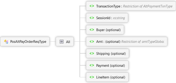 <xs:complexTypename="PosAltPayOrderReqType"xmlns:xs="http://www.w3.org/2001/XMLSchema"><xs:all><xs:elementname="TransactionType"type="AltPaymentTxnType"><xs:annotation><xs:documentation><pxmlns="http://Hps.Exchange.PosGateway">Alternate Payment Transaction Type</p></xs:documentation></xs:annotation></xs:element><xs:elementname="SessionId"type="xs:string"><xs:annotation><xs:documentation><pxmlns="http://Hps.Exchange.PosGateway">Unique Session Id</p></xs:documentation></xs:annotation></xs:element><xs:elementname="Buyer"minOccurs="0"><xs:annotation><xs:documentation><pxmlns="http://Hps.Exchange.PosGateway">Buyer Information for the order</p></xs:documentation></xs:annotation><xs:complexType><xs:sequencemaxOccurs="50"><xs:elementname="NameValuePair"type="NameValuePairType"/></xs:sequence></xs:complexType></xs:element><xs:elementname="Amt"type="amtTypeGlobal"minOccurs="0"><xs:annotation><xs:documentation><pxmlns="http://Hps.Exchange.PosGateway">Amount for the order</p></xs:documentation></xs:annotation></xs:element><xs:elementname="Shipping"minOccurs="0"><xs:annotation><xs:documentation><pxmlns="http://Hps.Exchange.PosGateway">Shipping Information for the order</p></xs:documentation></xs:annotation><xs:complexType><xs:sequencemaxOccurs="10"><xs:elementname="Address"type="NameValuePairCollectionType"><xs:annotation><xs:documentation>Address Information</xs:documentation></xs:annotation></xs:element></xs:sequence></xs:complexType></xs:element><xs:elementname="Payment"minOccurs="0"><xs:annotation><xs:documentation><pxmlns="http://Hps.Exchange.PosGateway">Payment Information for the order</p></xs:documentation></xs:annotation><xs:complexType><xs:sequencemaxOccurs="200"><xs:elementname="NameValuePair"type="NameValuePairType"/></xs:sequence></xs:complexType></xs:element><xs:elementname="LineItem"minOccurs="0"><xs:annotation><xs:documentation><pxmlns="http://Hps.Exchange.PosGateway">Line Item purchase information for the order</p></xs:documentation></xs:annotation><xs:complexType><xs:sequencemaxOccurs="100"><xs:elementname="Detail"type="NameValuePairCollectionType"><xs:annotation><xs:documentation>Detail Information</xs:documentation></xs:annotation></xs:element></xs:sequence></xs:complexType></xs:element></xs:all></xs:complexType>