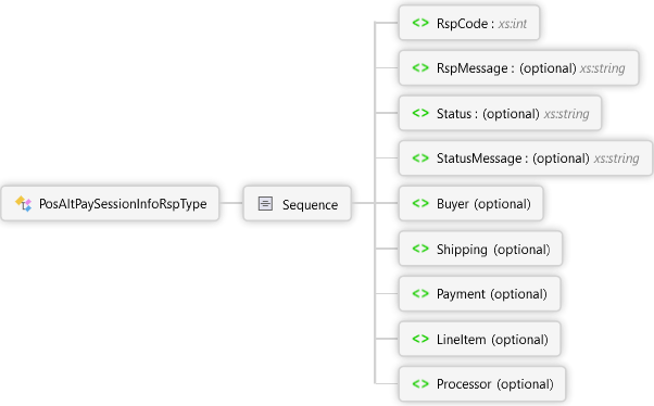 <xs:complexTypename="PosAltPaySessionInfoRspType"xmlns:xs="http://www.w3.org/2001/XMLSchema"><xs:sequence><xs:elementname="RspCode"type="xs:int"><xs:annotation><xs:documentation><pxmlns="http://Hps.Exchange.PosGateway">Response (result) code indicating the overall success of the transaction; '0' indicates success while non-zero indicates a failure.</p></xs:documentation></xs:annotation></xs:element><xs:elementname="RspMessage"type="xs:string"minOccurs="0"><xs:annotation><xs:documentation><pxmlns="http://Hps.Exchange.PosGateway">Response message returned by the processor</p></xs:documentation></xs:annotation></xs:element><xs:elementname="Status"type="xs:string"minOccurs="0"><xs:annotation><xs:documentation><pxmlns="http://Hps.Exchange.PosGateway">Status from processors processing of the transaction</p></xs:documentation></xs:annotation></xs:element><xs:elementname="StatusMessage"type="xs:string"minOccurs="0"><xs:annotation><xs:documentation><pxmlns="http://Hps.Exchange.PosGateway">Status message from processors processing of the transaction</p></xs:documentation></xs:annotation></xs:element><xs:elementname="Buyer"minOccurs="0"><xs:annotation><xs:documentation><pxmlns="http://Hps.Exchange.PosGateway">Buyer Information</p></xs:documentation></xs:annotation><xs:complexType><xs:sequenceminOccurs="0"maxOccurs="unbounded"><xs:elementname="NameValuePair"type="NameValuePairType"/></xs:sequence></xs:complexType></xs:element><xs:elementname="Shipping"minOccurs="0"><xs:annotation><xs:documentation><pxmlns="http://Hps.Exchange.PosGateway">Shipping Information for the Session</p></xs:documentation></xs:annotation><xs:complexType><xs:sequencemaxOccurs="10"><xs:elementname="Address"type="NameValuePairCollectionType"><xs:annotation><xs:documentation>Address Information</xs:documentation></xs:annotation></xs:element></xs:sequence></xs:complexType></xs:element><xs:elementname="Payment"minOccurs="0"><xs:annotation><xs:documentation><pxmlns="http://Hps.Exchange.PosGateway">Payment Information for the Session</p></xs:documentation></xs:annotation><xs:complexType><xs:sequencemaxOccurs="200"><xs:elementname="NameValuePair"type="NameValuePairType"/></xs:sequence></xs:complexType></xs:element><xs:elementname="LineItem"minOccurs="0"><xs:annotation><xs:documentation><pxmlns="http://Hps.Exchange.PosGateway">Line Item purchase information for the session</p></xs:documentation></xs:annotation><xs:complexType><xs:sequencemaxOccurs="100"><xs:elementname="Detail"type="NameValuePairCollectionType"><xs:annotation><xs:documentation>Detail Information</xs:documentation></xs:annotation></xs:element></xs:sequence></xs:complexType></xs:element><xs:elementname="Processor"minOccurs="0"><xs:annotation><xs:documentation><pxmlns="http://Hps.Exchange.PosGateway">Additional processor response information</p></xs:documentation></xs:annotation><xs:complexType><xs:sequencemaxOccurs="100"><xs:elementname="Response"type="NameValuePairCollectionType"><xs:annotation><xs:documentation>Response Information</xs:documentation></xs:annotation></xs:element></xs:sequence></xs:complexType></xs:element></xs:sequence></xs:complexType>