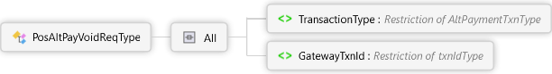 <xs:complexTypename="PosAltPayVoidReqType"xmlns:xs="http://www.w3.org/2001/XMLSchema"><xs:all><xs:elementname="TransactionType"type="AltPaymentTxnType"><xs:annotation><xs:documentation><pxmlns="http://Hps.Exchange.PosGateway">Alternate Payment Transaction Type</p></xs:documentation></xs:annotation></xs:element><xs:elementname="GatewayTxnId"type="txnIdType"><xs:annotation><xs:documentation><pxmlns="http://Hps.Exchange.PosGateway">Gateway generated transaction identifier returned in the response of the original transaction. This indicates the Alt Payment transaction to be voided.</p></xs:documentation></xs:annotation></xs:element></xs:all></xs:complexType>