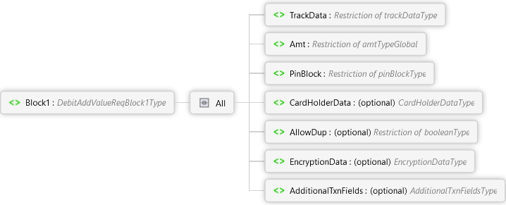 <xs:elementname="Block1"type="DebitAddValueReqBlock1Type"xmlns:xs="http://www.w3.org/2001/XMLSchema"><xs:annotation><xs:documentation><pxmlns="http://Hps.Exchange.PosGateway">Contains a series of required and optional elements</p></xs:documentation></xs:annotation></xs:element>