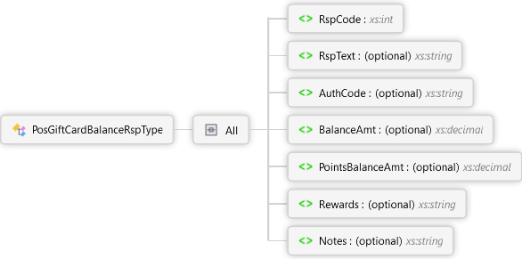 <xs:complexTypename="PosGiftCardBalanceRspType"xmlns:xs="http://www.w3.org/2001/XMLSchema"><xs:all><xs:elementname="RspCode"type="xs:int"><xs:annotation><xs:documentation><pxmlns="http://Hps.Exchange.PosGateway">Response (result) code returned by the issuer</p></xs:documentation></xs:annotation></xs:element><xs:elementname="RspText"type="xs:string"minOccurs="0"><xs:annotation><xs:documentation><pxmlns="http://Hps.Exchange.PosGateway">Response (result) text returned by the issuer</p></xs:documentation></xs:annotation></xs:element><xs:elementname="AuthCode"type="xs:string"minOccurs="0"><xs:annotation><xs:documentation><pxmlns="http://Hps.Exchange.PosGateway">If authorized, authorization code returned by the issuer</p></xs:documentation></xs:annotation></xs:element><xs:elementname="BalanceAmt"type="xs:decimal"minOccurs="0"><xs:annotation><xs:documentation><pxmlns="http://Hps.Exchange.PosGateway">Balance on the account after the transaction</p></xs:documentation></xs:annotation></xs:element><xs:elementname="PointsBalanceAmt"type="xs:decimal"minOccurs="0"><xs:annotation><xs:documentation><pxmlns="http://Hps.Exchange.PosGateway">Points balance on the account after the transaction</p></xs:documentation></xs:annotation></xs:element><xs:elementname="Rewards"type="xs:string"minOccurs="0"><xs:annotation><xs:documentation><pxmlns="http://Hps.Exchange.PosGateway">Identifies rewards added to the account as a result of a transaction</p></xs:documentation></xs:annotation></xs:element><xs:elementname="Notes"type="xs:string"minOccurs="0"><xs:annotation><xs:documentation><pxmlns="http://Hps.Exchange.PosGateway">Contains rewards messages to be displayed by the client to inform an account holder about special rewards or promotions available</p></xs:documentation></xs:annotation></xs:element></xs:all></xs:complexType>