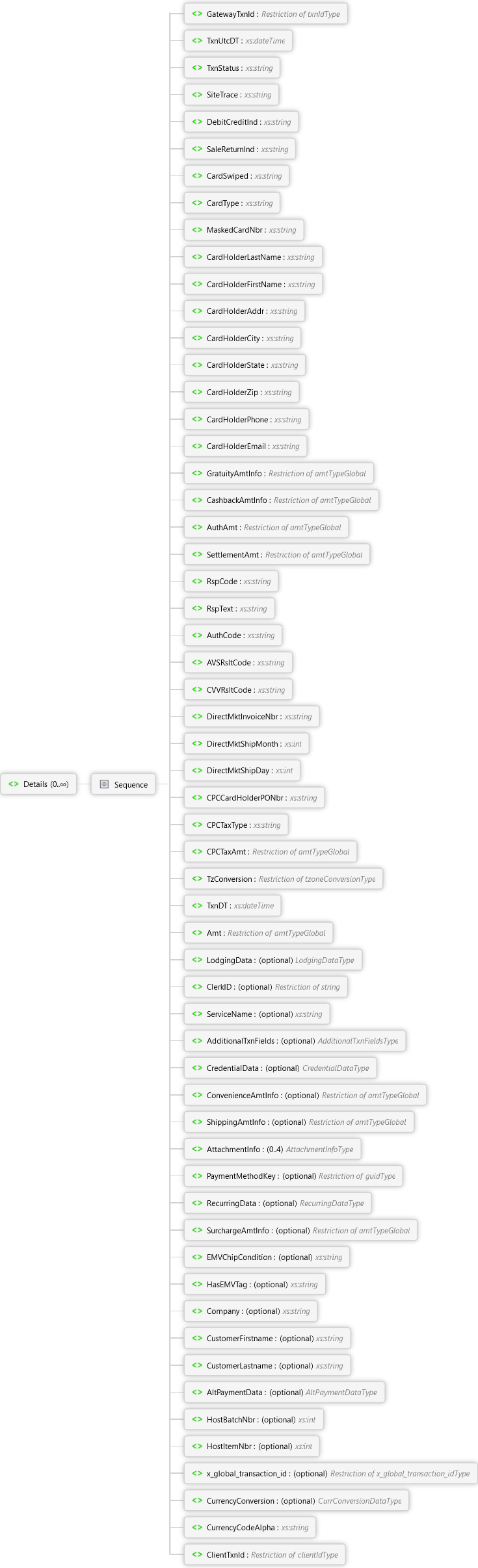 Note: If the data was defined in the request or response, a description has not been added here; only fields that are being introduced in this response have additional detail added. Typically, these will be fields that drive business logic that can be assumed at the time of the transaction or they are calculated at the time of the report.