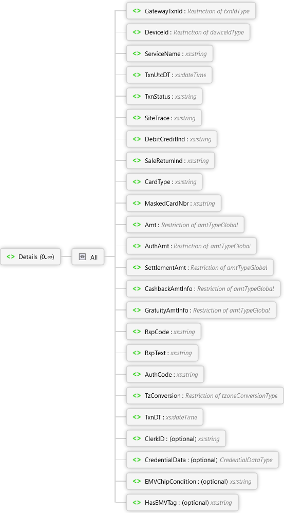 Note: If the data was defined in the request or response, a description has not been added here; only fields that are being introduced in this response have additional detail added. Typically, these will be fields that drive business logic that can be assumed at the time of the transaction or they are calculated at the time of the report.