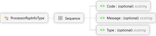 <xs:complexTypename="ProcessorRspInfoType"xmlns:xs="http://www.w3.org/2001/XMLSchema"><xs:sequence><xs:elementname="Code"type="xs:string"minOccurs="0"><xs:annotation><xs:documentation><pxmlns="http://Hps.Exchange.PosGateway">Code from processor response</p></xs:documentation></xs:annotation></xs:element><xs:elementname="Message"type="xs:string"minOccurs="0"><xs:annotation><xs:documentation><pxmlns="http://Hps.Exchange.PosGateway">Message from processor response</p></xs:documentation></xs:annotation></xs:element><xs:elementname="Type"type="xs:string"minOccurs="0"><xs:annotation><xs:documentation><pxmlns="http://Hps.Exchange.PosGateway">Type of processor response</p></xs:documentation></xs:annotation></xs:element></xs:sequence></xs:complexType>