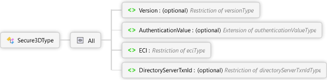 <xs:complexTypename="Secure3DType"xmlns:xs="http://www.w3.org/2001/XMLSchema"><xs:all><xs:elementname="Version"type="versionType"default="2"minOccurs="0"><xs:annotation><xs:documentation><pxmlns="http://Hps.Exchange.PosGateway">Indicates 3DS version used for authentication.</p><pxmlns="http://Hps.Exchange.PosGateway">Valid values include:</p><ulxmlns="http://Hps.Exchange.PosGateway"><li> 1 = 3DS 1.x (no longer supported)</li><li> 2 = 3DS 2.2 </li><li> 3 = 3DS 2.3 (Future Use)</li><li> 4 = 3DS 2.4 (Future Use)</li><li> 5 = 3DS 2.5 (Future Use)</li><li> 6 = 3DS 2.6 (Future Use)</li><li> 7 = 3DS 2.7 (Future Use)</li><li> 8 = 3DS 2.8 (Future Use)</li><li> 9 = 3DS 2.9 (Future Use)</li></ul></xs:documentation></xs:annotation></xs:element><xs:elementname="AuthenticationValue"minOccurs="0"><xs:annotation><xs:documentation><pxmlns="http://Hps.Exchange.PosGateway">This value is the reference generated by the issuer to recognize that the authentication has taken place. Supported formats are CAVV, AEVV, UCAF. Must be encoded using base16 (Hex encoding) or base64 encoding.</p></xs:documentation></xs:annotation><xs:complexType><xs:simpleContent><xs:extensionbase="authenticationValueType"><xs:attributename="encoding"type="EncodingType"default="base64"><xs:annotation><xs:documentation><pxmlns="http://Hps.Exchange.PosGateway">Encoding used to encode binary AuthenticationValue. Default is base64.</p></xs:documentation></xs:annotation></xs:attribute></xs:extension></xs:simpleContent></xs:complexType></xs:element><xs:elementname="ECI"type="eciType"minOccurs="1"><xs:annotation><xs:documentation><pxmlns="http://Hps.Exchange.PosGateway">Electronic Commerce Indicator shows the value of the result of the authentication.</p><pxmlns="http://Hps.Exchange.PosGateway"><strong>Note:</strong> This value represents UCI for MasterCard.