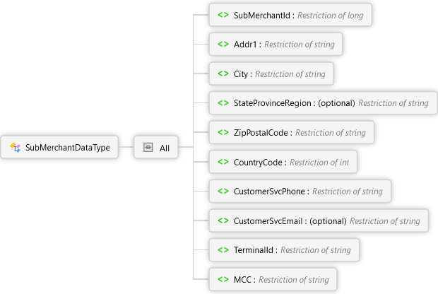 <xs:complexTypename="SubMerchantDataType"xmlns:xs="http://www.w3.org/2001/XMLSchema"><xs:all><xs:elementname="SubMerchantId"><xs:annotation><xs:documentation><pxmlns="http://Hps.Exchange.PosGateway">The ID assigned by the payment facilitator or aggregator to the sub-merchant.</p><pxmlns="http://Hps.Exchange.PosGateway"><strong>Note:</strong> For internal use only.