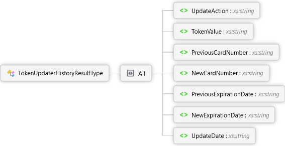 <xs:complexTypename="TokenUpdaterHistoryResultType"xmlns:xs="http://www.w3.org/2001/XMLSchema"><xs:all><xs:elementname="UpdateAction"type="xs:string"><xs:annotation><xs:documentation><pxmlns="http://Hps.Exchange.PosGateway">Type of update that was performed</p></xs:documentation></xs:annotation></xs:element><xs:elementname="TokenValue"type="xs:string"><xs:annotation><xs:documentation><pxmlns="http://Hps.Exchange.PosGateway">Multi-use or single-use token; used as a reference to a payment method for this transaction</p></xs:documentation></xs:annotation></xs:element><xs:elementname="PreviousCardNumber"type="xs:string"><xs:annotation><xs:documentation><pxmlns="http://Hps.Exchange.PosGateway">Displays the first 6 and last 4 digits of the PAN prior to the update performed</p></xs:documentation></xs:annotation></xs:element><xs:elementname="NewCardNumber"type="xs:string"><xs:annotation><xs:documentation><pxmlns="http://Hps.Exchange.PosGateway">Displays the first 6 and last 4 digits of the PAN after the update was performed</p></xs:documentation></xs:annotation></xs:element><xs:elementname="PreviousExpirationDate"type="xs:string"><xs:annotation><xs:documentation><pxmlns="http://Hps.Exchange.PosGateway">Displays the expiration date prior to the update performed</p></xs:documentation></xs:annotation></xs:element><xs:elementname="NewExpirationDate"type="xs:string"><xs:annotation><xs:documentation><pxmlns="http://Hps.Exchange.PosGateway">Displays the expiration date after the update was performed</p></xs:documentation></xs:annotation></xs:element><xs:elementname="UpdateDate"type="xs:string"><xs:annotation><xs:documentation><pxmlns="http://Hps.Exchange.PosGateway">Date the update was performed</p></xs:documentation></xs:annotation></xs:element></xs:all></xs:complexType>