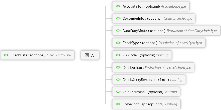 <xs:elementname="CheckData"type="CheckDataType"minOccurs="0"xmlns:xs="http://www.w3.org/2001/XMLSchema"><xs:annotation><xs:documentation><pxmlns="http://Hps.Exchange.PosGateway">A collection of check transaction related fields</p></xs:documentation></xs:annotation></xs:element>