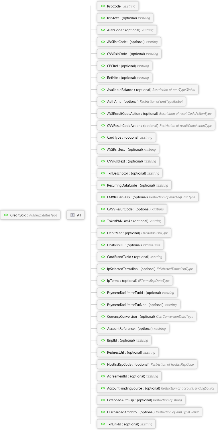 TxnLinkId Element DischargedAmtInfo Element ExtendedAuthRsp Element AccountFundingSource Element AgreementId Element HostIssRspCode Element RedirectUrl Element BnplId Element AccountReference Element CurrencyConversion Element PaymentFacilitatorTxnNbr Element PaymentFacilitatorTxnId Element IpTerms Element IpSelectedTermsRsp Element CardBrandTxnId Element HostRspDT Element DebitMac Element TokenPANLast4 Element CAVVResultCode Element EMVIssuerResp Element RecurringDataCode Element TxnDescriptor Element CVVRsltText Element AVSRsltText Element CardType Element CVVResultCodeAction Element AVSResultCodeAction Element AuthAmt Element AvailableBalance Element RefNbr Element CPCInd Element CVVRsltCode Element AVSRsltCode Element AuthCode Element RspText Element RspCode Element All CreditVoid Element