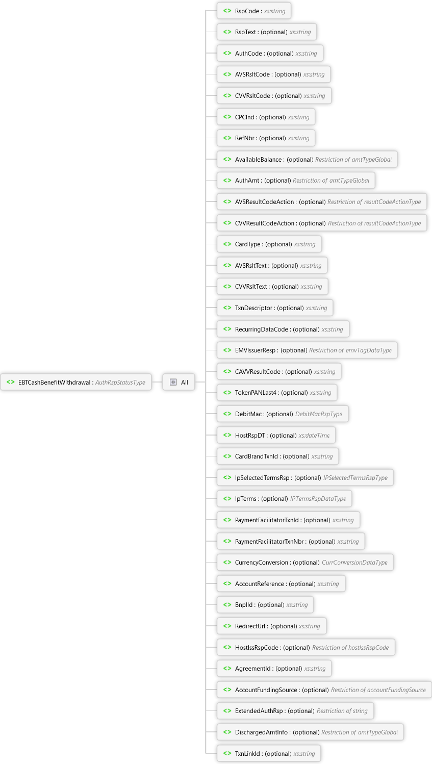 TxnLinkId Element DischargedAmtInfo Element ExtendedAuthRsp Element AccountFundingSource Element AgreementId Element HostIssRspCode Element RedirectUrl Element BnplId Element AccountReference Element CurrencyConversion Element PaymentFacilitatorTxnNbr Element PaymentFacilitatorTxnId Element IpTerms Element IpSelectedTermsRsp Element CardBrandTxnId Element HostRspDT Element DebitMac Element TokenPANLast4 Element CAVVResultCode Element EMVIssuerResp Element RecurringDataCode Element TxnDescriptor Element CVVRsltText Element AVSRsltText Element CardType Element CVVResultCodeAction Element AVSResultCodeAction Element AuthAmt Element AvailableBalance Element RefNbr Element CPCInd Element CVVRsltCode Element AVSRsltCode Element AuthCode Element RspText Element RspCode Element All EBTCashBenefitWithdrawal Element