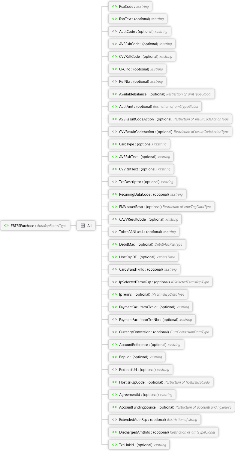 TxnLinkId Element DischargedAmtInfo Element ExtendedAuthRsp Element AccountFundingSource Element AgreementId Element HostIssRspCode Element RedirectUrl Element BnplId Element AccountReference Element CurrencyConversion Element PaymentFacilitatorTxnNbr Element PaymentFacilitatorTxnId Element IpTerms Element IpSelectedTermsRsp Element CardBrandTxnId Element HostRspDT Element DebitMac Element TokenPANLast4 Element CAVVResultCode Element EMVIssuerResp Element RecurringDataCode Element TxnDescriptor Element CVVRsltText Element AVSRsltText Element CardType Element CVVResultCodeAction Element AVSResultCodeAction Element AuthAmt Element AvailableBalance Element RefNbr Element CPCInd Element CVVRsltCode Element AVSRsltCode Element AuthCode Element RspText Element RspCode Element All EBTFSPurchase Element