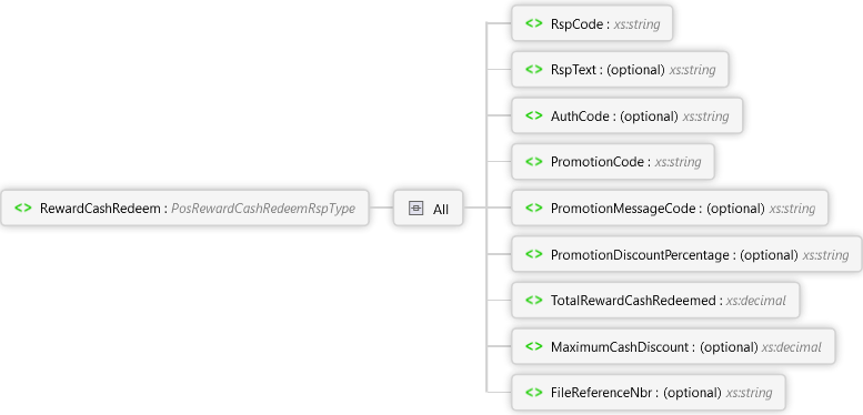 FileReferenceNbr Element MaximumCashDiscount Element TotalRewardCashRedeemed Element PromotionDiscountPercentage Element PromotionMessageCode Element PromotionCode Element AuthCode Element RspText Element RspCode Element All RewardCashRedeem Element