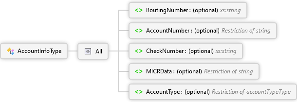 <xs:complexTypename="AccountInfoType"xmlns:xs="http://www.w3.org/2001/XMLSchema"><xs:all><xs:elementname="RoutingNumber"type="xs:string"minOccurs="0"><xs:annotation><xs:documentation><pxmlns="http://Hps.Exchange.PosGateway">Check routing number; manually entered or parsed from MICR data.</p></xs:documentation></xs:annotation></xs:element><xs:elementname="AccountNumber"minOccurs="0"><xs:annotation><xs:documentation><pxmlns="http://Hps.Exchange.PosGateway">Check account number; manually entered or parsed from MICR data.</p></xs:documentation></xs:annotation><xs:simpleType><xs:restrictionbase="xs:string"><xs:maxLengthvalue="20"/></xs:restriction></xs:simpleType></xs:element><xs:elementname="CheckNumber"type="xs:string"minOccurs="0"><xs:annotation><xs:documentation><pxmlns="http://Hps.Exchange.PosGateway">The physical check number; manually entered or parsed from MICR data.</p></xs:documentation></xs:annotation></xs:element><xs:elementname="MICRData"minOccurs="0"><xs:annotation><xs:documentation><pxmlns="http://Hps.Exchange.PosGateway">Magnetic ink character recognition (MICR) data obtained from a check reader.</p></xs:documentation></xs:annotation><xs:simpleType><xs:restrictionbase="xs:string"><xs:maxLengthvalue="220"/></xs:restriction></xs:simpleType></xs:element><xs:elementname="AccountType"type="accountTypeType"minOccurs="0"><xs:annotation><xs:documentation><pxmlns="http://Hps.Exchange.PosGateway">Indicates the type of account provided; see the associated Type enumerations for specific values supported.</p><pxmlns="http://Hps.Exchange.PosGateway"/><pxmlns="http://Hps.Exchange.PosGateway"><strong>Note:</strong> If processing with Colonnade, AccountType must be specified.</p></xs:documentation></xs:annotation></xs:element></xs:all></xs:complexType>