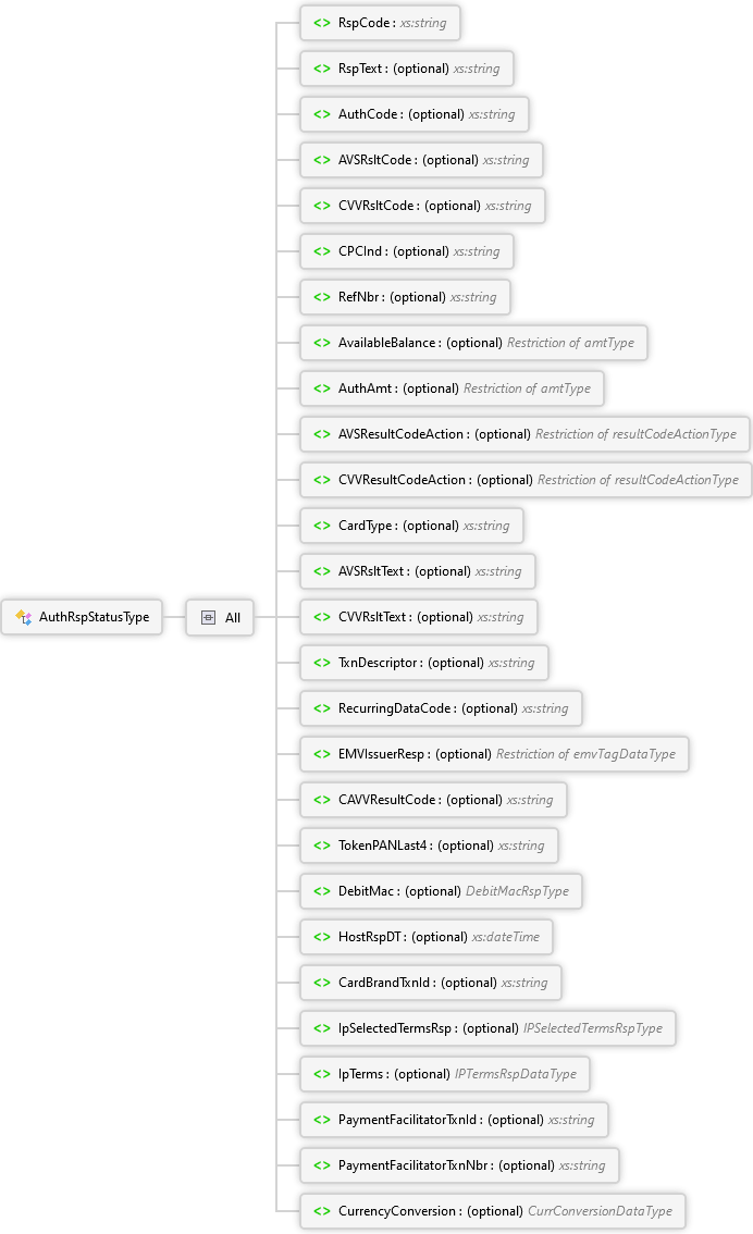 CurrencyConversion Element PaymentFacilitatorTxnNbr Element PaymentFacilitatorTxnId Element IpTerms Element IpSelectedTermsRsp Element CardBrandTxnId Element HostRspDT Element DebitMac Element TokenPANLast4 Element CAVVResultCode Element EMVIssuerResp Element RecurringDataCode Element TxnDescriptor Element CVVRsltText Element AVSRsltText Element CardType Element CVVResultCodeAction Element AVSResultCodeAction Element AuthAmt Element AvailableBalance Element RefNbr Element CPCInd Element CVVRsltCode Element AVSRsltCode Element AuthCode Element RspText Element RspCode Element All AuthRspStatusType Complex Type