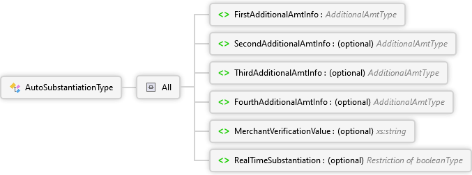 RealTimeSubstantiation Element MerchantVerificationValue Element FourthAdditionalAmtInfo Element ThirdAdditionalAmtInfo Element SecondAdditionalAmtInfo Element FirstAdditionalAmtInfo Element All AutoSubstantiationType Complex Type