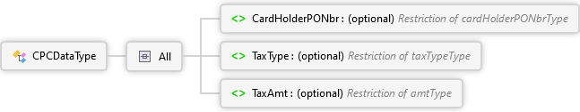 <xs:complexTypename="CPCDataType"xmlns:xs="http://www.w3.org/2001/XMLSchema"><xs:all><xs:elementname="CardHolderPONbr"type="cardHolderPONbrType"minOccurs="0"><xs:annotation><xs:documentation><pxmlns="http://Hps.Exchange.PosGateway">Purchase order number</p></xs:documentation></xs:annotation></xs:element><xs:elementname="TaxType"type="taxTypeType"minOccurs="0"><xs:annotation><xs:documentation><pxmlns="http://Hps.Exchange.PosGateway">Tax type indicator that qualifies the associated tax amount, see the associated Type enumerations for specific values supported.</p></xs:documentation></xs:annotation></xs:element><xs:elementname="TaxAmt"type="amtType"minOccurs="0"><xs:annotation><xs:documentation><pxmlns="http://Hps.Exchange.PosGateway">Tax amount</p><pxmlns="http://Hps.Exchange.PosGateway"/><pxmlns="http://Hps.Exchange.PosGateway"><strong>Note:</strong> If the tax type is 'TaxExempt', an amount should not be provided. If it is, the gateway discards the amount.</p></xs:documentation></xs:annotation></xs:element></xs:all></xs:complexType>