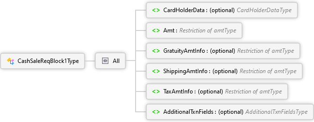 AdditionalTxnFields Element TaxAmtInfo Element ShippingAmtInfo Element GratuityAmtInfo Element Amt Element CardHolderData Element All CashSaleReqBlock1Type Complex Type