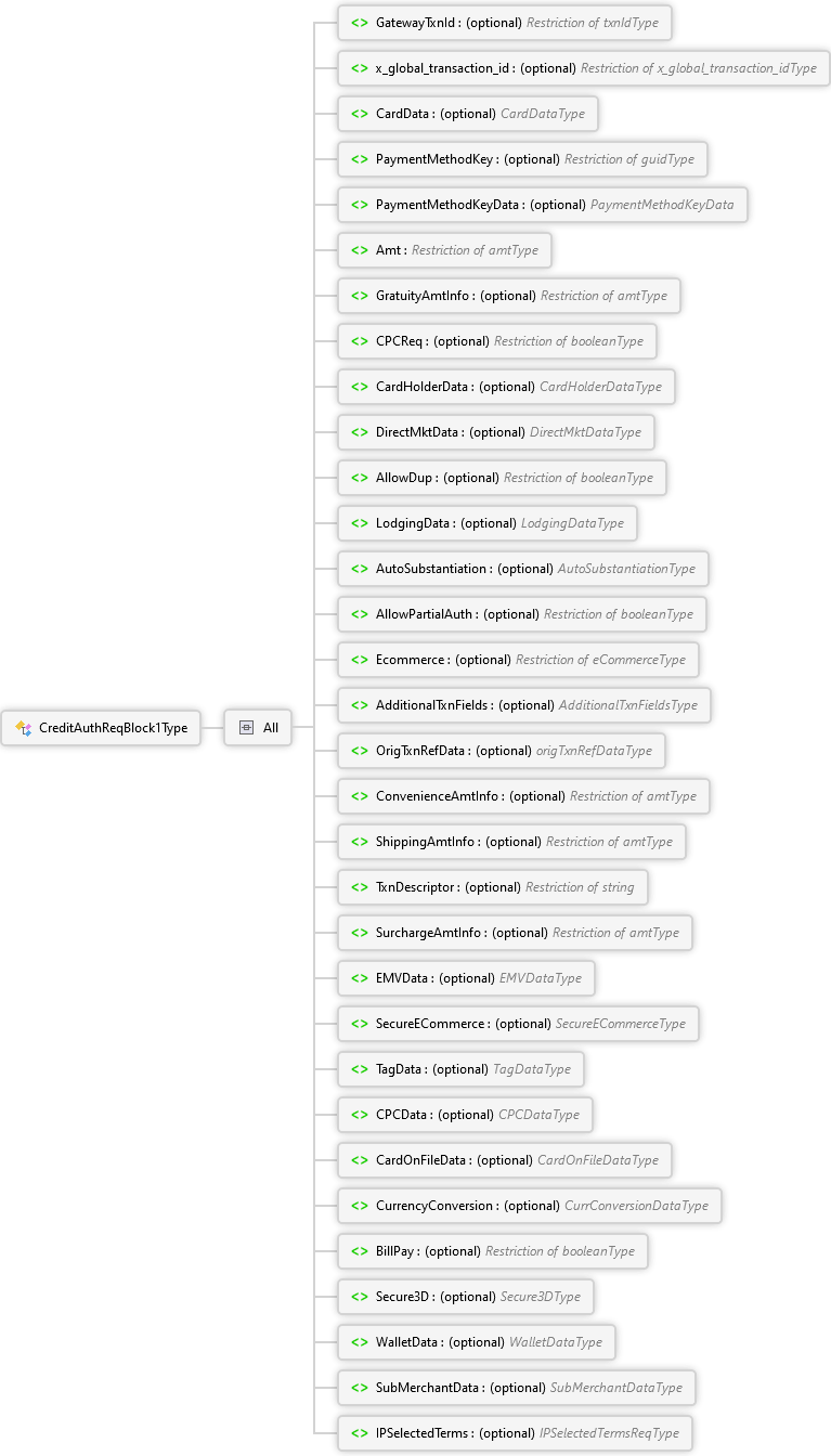 This includes a choice of typical payment representations like track data, manually entered data, and token information. It also includes options for specifying how the supplied data has been encrypted or to request a multi-use token be supplied in the response.