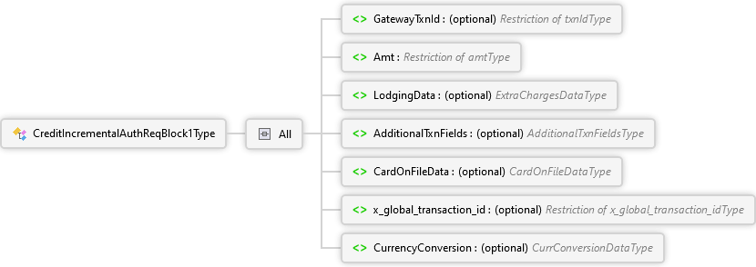 <xs:complexTypename="CreditIncrementalAuthReqBlock1Type"xmlns:xs="http://www.w3.org/2001/XMLSchema"><xs:all><xs:elementname="GatewayTxnId"type="txnIdType"default="-1"minOccurs="0"><xs:annotation><xs:documentation><pxmlns="http://Hps.Exchange.PosGateway">Gateway-generated transaction identifier returned in the response of the original transaction.</p></xs:documentation></xs:annotation></xs:element><xs:elementname="Amt"type="amtType"><xs:annotation><xs:documentation><pxmlns="http://Hps.Exchange.PosGateway">The amount requested for authorization</p></xs:documentation></xs:annotation></xs:element><xs:elementname="LodgingData"type="ExtraChargesDataType"minOccurs="0"><xs:annotation><xs:documentation><pxmlns="http://Hps.Exchange.PosGateway">Lodging extra charge indicators; common group of elements that provide additional details specific to lodging transactions that may be required in certain situations as determined by the brands</p><pxmlns="http://Hps.Exchange.PosGateway"/><pxmlns="http://Hps.Exchange.PosGateway"><strong>Note:</strong> The field name LodgingData can be confusing in this case as it is actually referring to the lodging extra charges data type.</p></xs:documentation></xs:annotation></xs:element><xs:elementname="AdditionalTxnFields"type="AdditionalTxnFieldsType"minOccurs="0"><xs:annotation><xs:documentation><pxmlns="http://Hps.Exchange.PosGateway">A common group of optional fields that are supported in several different transaction types for Merchant use.</p></xs:documentation></xs:annotation></xs:element><xs:elementname="CardOnFileData"type="CardOnFileDataType"minOccurs="0"><xs:annotation><xs:documentation><pxmlns="http://Hps.Exchange.PosGateway">Card On File Data</p><pxmlns="http://Hps.Exchange.PosGateway">For Credit Incremental Auth transactions, this data is used for Exchange-hosted merchants only. For GSAP, GNAP, and AP hosted merchants, the card on file data is obtained from the original Credit Auth being incremented.</p></xs:documentation></xs:annotation></xs:element><xs:elementname="x_global_transaction_id"type="x_global_transaction_idType"minOccurs="0"><xs:annotation><xs:documentation><pxmlns="http://Hps.Exchange.PosGateway">Client generated transaction identifier sent in the request of the original transaction. This indicates the transaction to be updated.</p><pxmlns="http://Hps.Exchange.PosGateway"/><pxmlns="http://Hps.Exchange.PosGateway"><strong>Note:</strong> This is for internal use only.</p></xs:documentation></xs:annotation></xs:element><xs:elementname="CurrencyConversion"type="CurrConversionDataType"minOccurs="0"><xs:annotation><xs:documentation><pxmlns="http://Hps.Exchange.PosGateway">Data block for Currency Conversion.</p></xs:documentation></xs:annotation></xs:element></xs:all></xs:complexType>