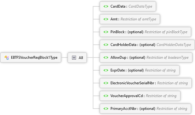 PrimaryAcctNbr Element VoucherApprovalCd Element ElectronicVoucherSerialNbr Element ExprDate Element AllowDup Element CardHolderData Element PinBlock Element Amt Element CardData Element All EBTFSVoucherReqBlock1Type Complex Type